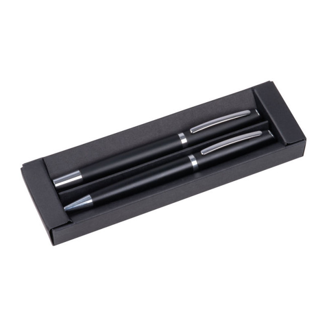 Writing set made of recycled aluminum, consisting of a ballpoint pen and a rollerball. The sleek design and blue-writing semi-gel refill (0.7 mm) ensure a smooth writing experience.