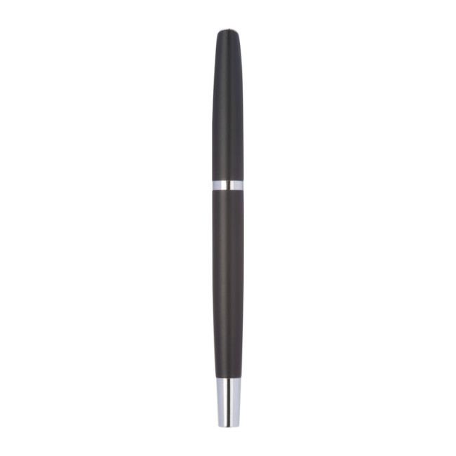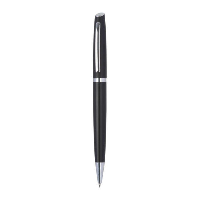 Black metal ballpoint pen with a grippy rubber finish, blue-writing refill, and touch function at th..