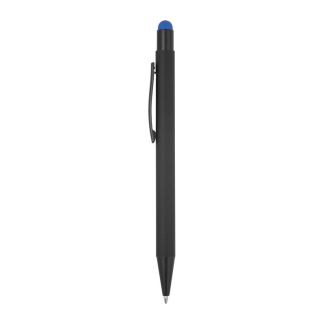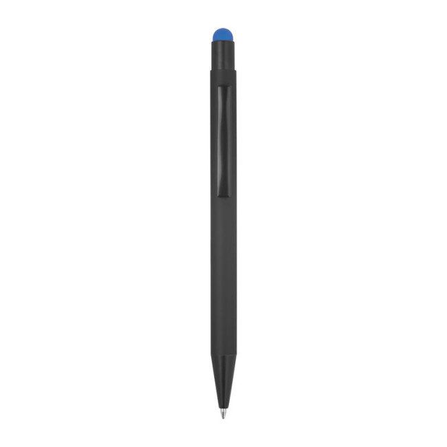 Black metal ballpoint pen with a grippy rubber finish, blue-writing refill, and touch function at the tip. The black body is complemented by a colored touch coating in various options – the color of the logo will match the tip color.