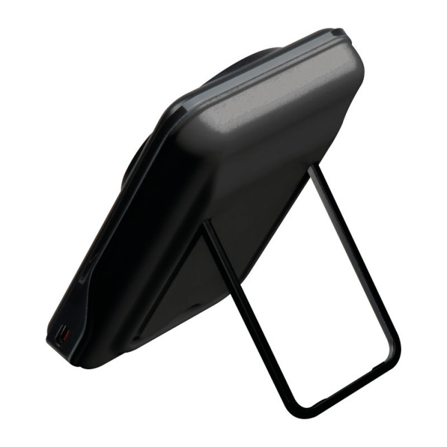 2in1 Magnetic wireless powerbank with stand, 10.000 mAh capacity. The stand allows the powerbank to be used as a smartphone holder. Includes 30 cm cable with USB-C plug, the powerbank has a USB-C and USB-A port.