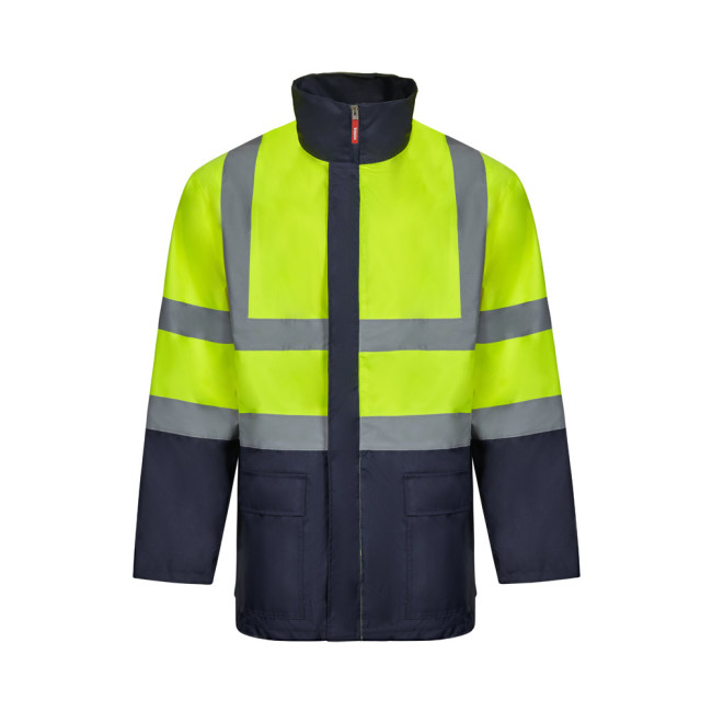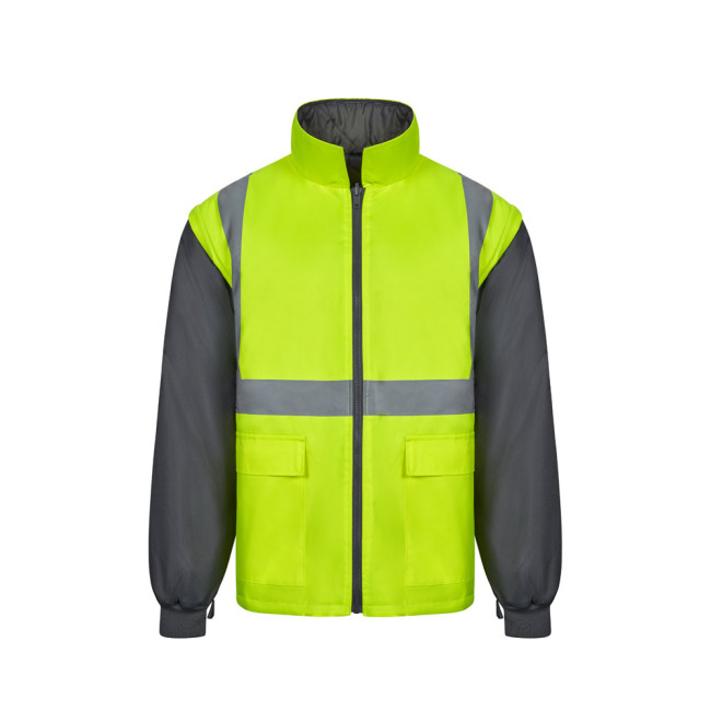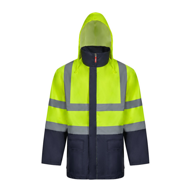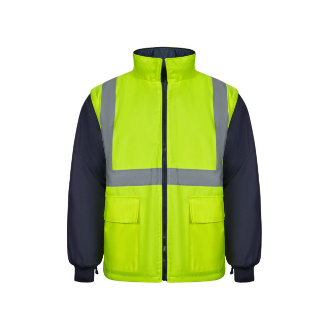 Two-tone 4-in-1 parka (180g/m²), in polyester (100%) with PU coating. Four pieces in one: parka, raincoat, jacket and vest.Parka/raincoat: with hidden central zip with placket, which closes with hook-and-loop, reflective stripes on the torso, shoulders and sleeves and hidden hood, with two lower pockets.Jacket/vest: with central zip, reflective stripes on the torso and shoulders, ribbed cuffs and detachable sleeves. With three pockets (2 lower pockets and 1 inner pocket). Product in compliance with EU Reg. 2016/425, certified by EN20471 and class Nº 2. Size: S, M, L, XL, 2XL, 3XL